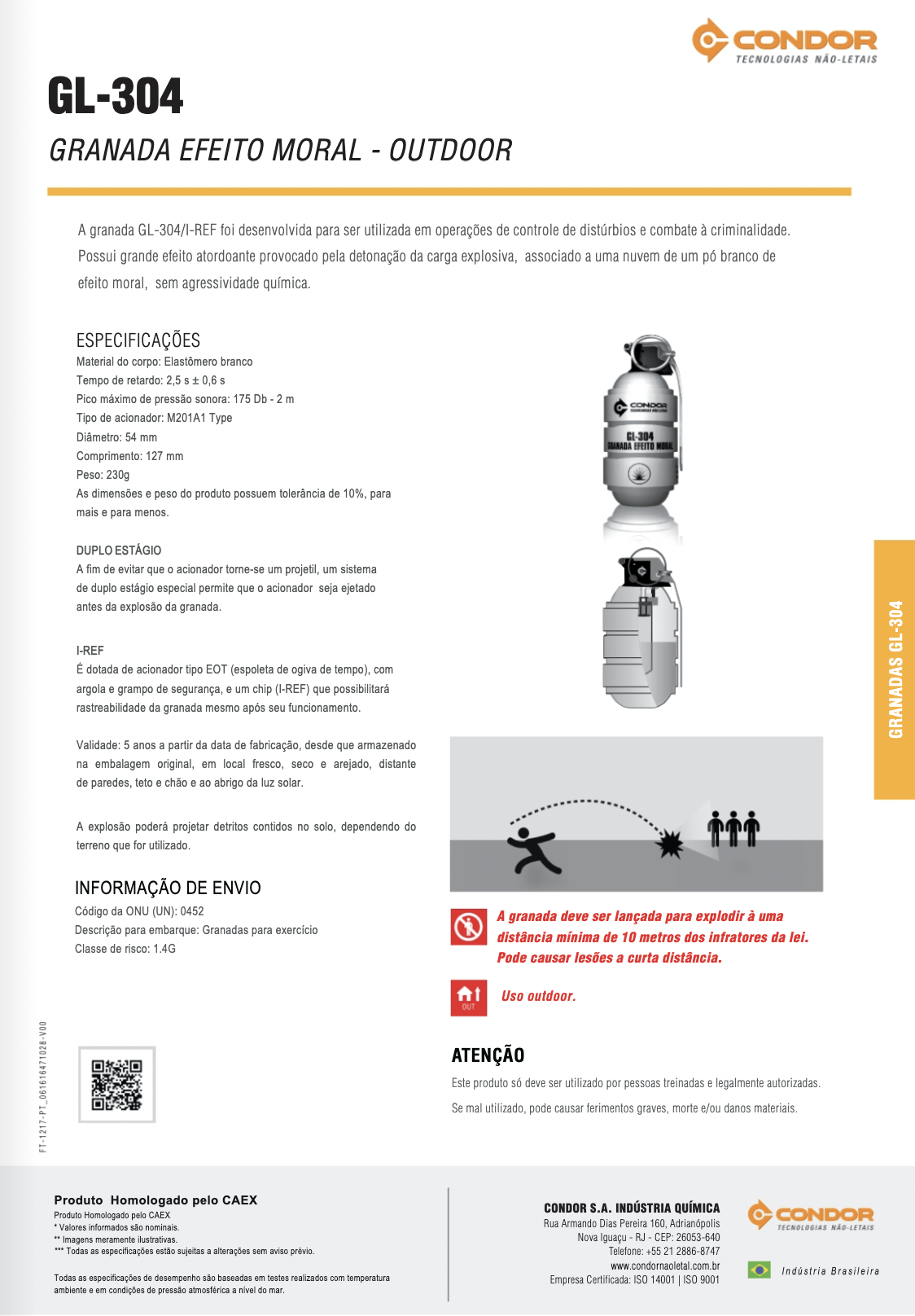 La GL-304 est une grenade dite assourdissante : elle désoriente par une détonation très bruyante. Le corps en caoutchouc noir est censé limiter les éclats dangereux. D’après le fabricant brésilien Condor, un système à double étage éjecte l’allumeur et le bouchon avant l’explosion, afin d’éviter qu’il ne devienne projectile. La grenade n’est utilisée qu’en lancé à la main.